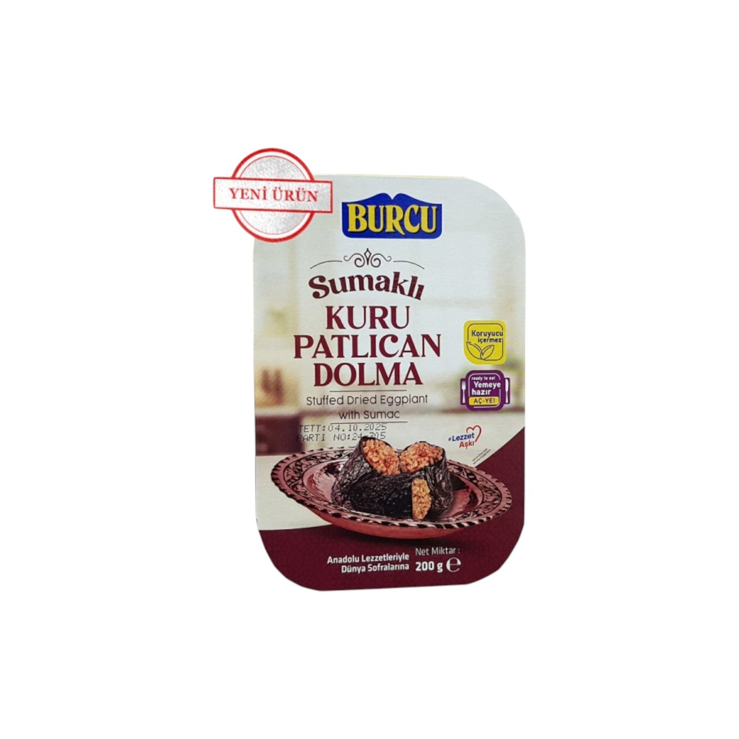 Burcu Sumaklı Patlıcan Dolma, kaliteli zeytinyağı ve sumak gibi sağlığa faydalı malzemelerle hazırlanarak hem lezzetli hem de besleyici bir alternatif oluşturur. Koruyucu içermeyen doğal yapısıyla güvenle tüketilebilen bu ürün, protein, lif ve antioksidan bakımından zengindir. Oda sıcaklığında veya hafif ısıtılarak servis edilebilen bu lezzetli dolma, ana yemek olarak tüketilebildiği gibi, meze olarak da sofraların gözdesi olabilir. Uzun raf ömrüne sahip pratik ambalajı sayesinde ev veya ofiste her an tüketmeye hazır olan Burcu Sumaklı Patlıcan Dolma, misafir ağırlamaktan piknik sepetlerine, hızlı öğle yemeklerinden akşam atıştırmalıklarına kadar geniş bir kullanım alanına sahiptir.